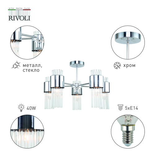 5-рожковая люстра на штанге в цвете хром, с трубчатыми стеклянными плафонами. Люстра потолочная применяется с 5 лампами Е14 мощностью 40 Вт, освещает площадь до 15 м2. Люстра с цилиндрическими плафонами из стекла будет удачно смотреться в гостиной, в спальне, на кухне, в кабинете, в загородном доме. Люстры и светильники коллекции Rivoli Deborah подходят для оформления пространств сегмента horeca – рестораны, кафе, гостиницы. Эти люстры потолочные заказывают в интерьеры театров, концертных залов, фойе общественных пространств. В коллекции Rivoli Deborah: люстра под 5 ламп - арт. 3148-305, люстра под 7 ламп - арт. 3148-307, светильник подвесной - арт. 3148-201, светильник настенный - арт. 3148-401.