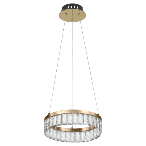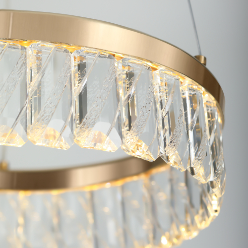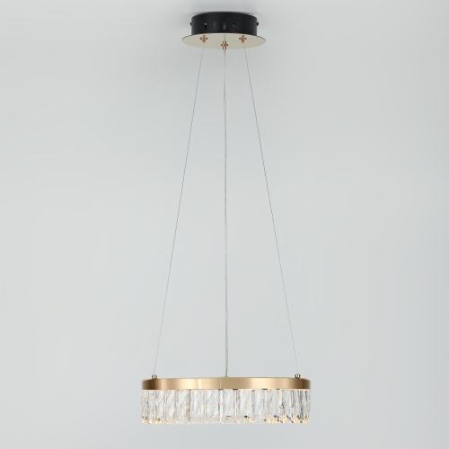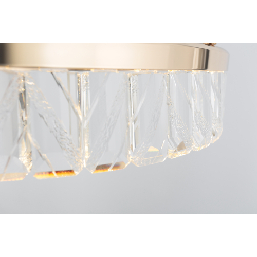 Главной дизайнерской особенностью люстры является большой золотой плафон в форме кольца диаметром 300 мм. Встроенные в плафон-кольцо светодиоды обеспечивают равномерное и мягкое освещение. Подвесная люстра дополнена изысканными хрустальными подвесками с уникальной гравировкой по стеклу, что придаёт ей особый шарм и делает её центральным акцентом в любом интерьере.
