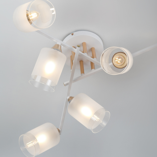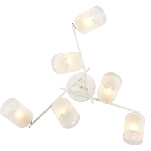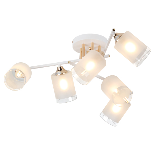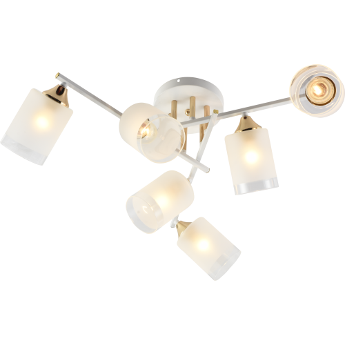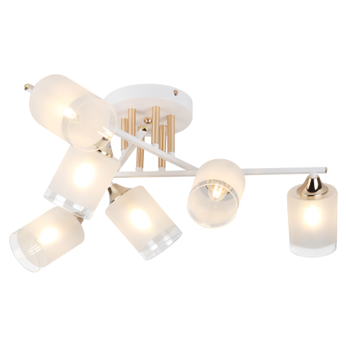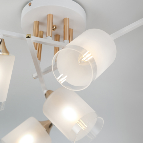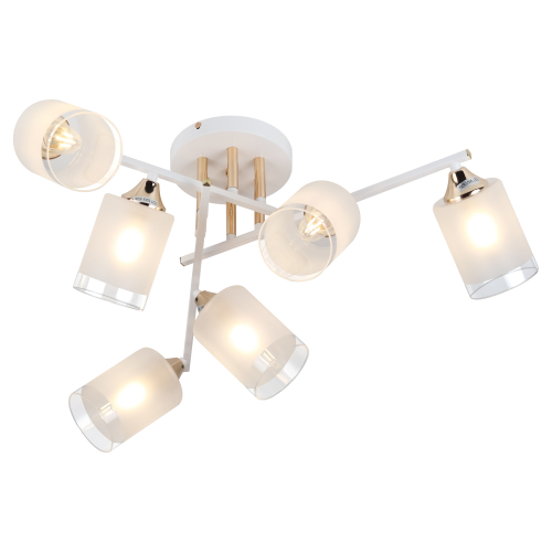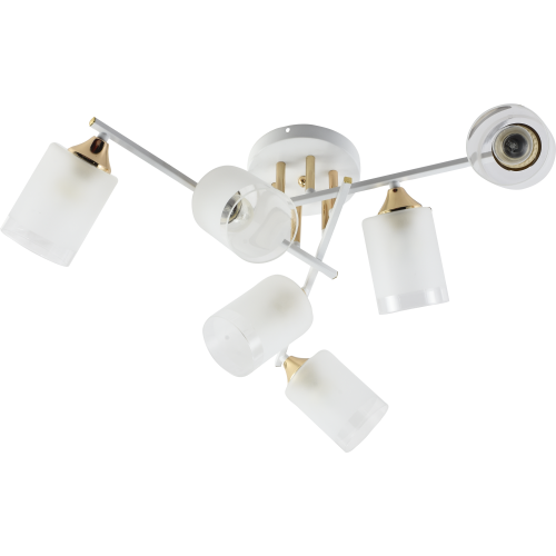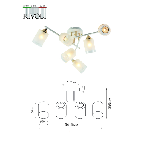 В коллекции Rivoli Georgiana представлены люстры с 4 плафонами (арт. 9144-203) и люстры с 6 плафонами (арт. 9144-205). Данная люстра потолочная под 6 ламп Е27 60 Вт предназначена для освещения площади до 18 м2, а значит подойдёт для гостиной, спальни и любой комнаты средней или большой площади. Рожки люстры выполнены в виде металлических реек, окрашенных в белый цвет. Основной цвет корпуса люстры дизайнерской Georgiana – белый, эффектный вид люстре придают детали золотого цвета. Матовые плафоны имеют прозрачный декоративный ободок. Люстры с матовыми плафонами хорошо подходят для жилых пространств, так как делают искусственное освещение более мягким.