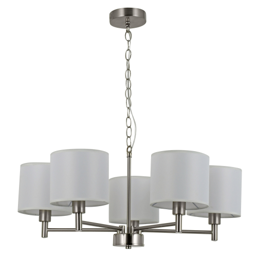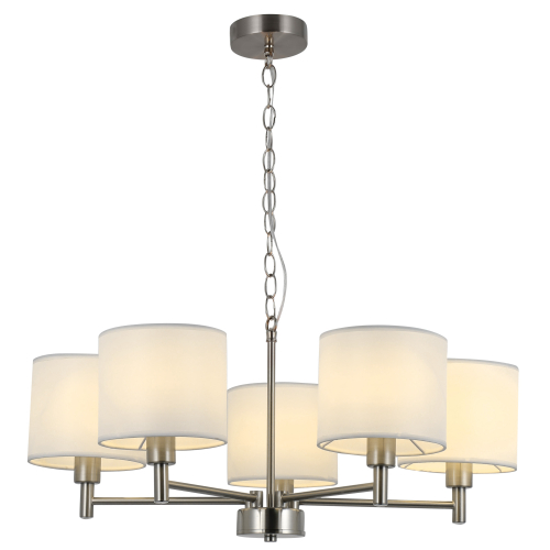 Пять цилиндрических абажуров равномерно распределяют свет, наполняя комнату мягким, рассеянным освещением без резких теней. Такая люстра отлично подойдёт для гостиной, спальни, столовой или кухни, создавая уютную атмосферу для отдыха и повседневной жизни.