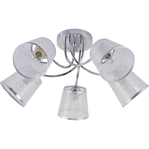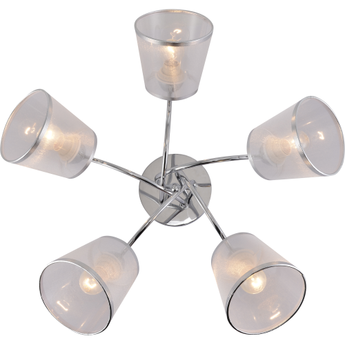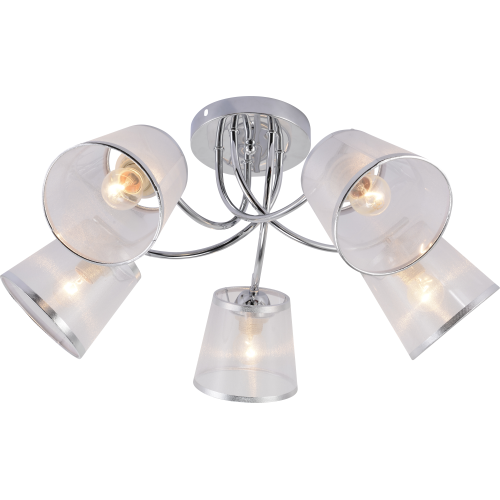 Серебристая люстра потолочная итальянского дизайна - Rivoli Shirley (арт. 9167-305). Пять металлических рожков люстры элегантно переплетаются между собой. Плафоны люстры под лампы Е27 60 Вт обтянуты светлой серебристой тканью с полупрозрачной текстурой. Тканевые абажурные плафоны современной люстры Shirley отлично пропускают свет. Освещаемая площадь люстры – до 15 м2. Модель подойдёт в качестве люстры в гостиную, люстры в спальню, люстры в детскую. Идеальный вариант люстры для любой комнаты в квартире или в доме. Коллекцию дополняет люстра на потолок с 3 плафонами – арт. 9167-303. Дизайнерские серые серебристые люстры Rivoli Shirly легки в уходе: ткань с пылеотталкивающими свойствами, корпус со стойким порошковым покрытием.