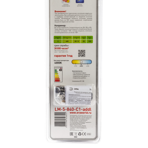 Дополнительный модуль к светильнику LM-5-840-С1, мощность 5Вт, срок службы 30000 часов. Напряжение питания 12В DC. Цветовая температура 4000K. Комплектация: светильник, крепежные клипсы, двусторонний скотч, соед. блок, соед. кабель 1м