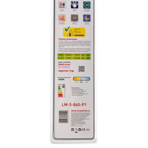 Светодиодный модуль с датчиком движения, мощность 5Вт, Срок службы 30000 часов. Напряжение питания 12В DC. Цветовая температура 4000K.. В комплекте: светодиодный модель, источник питания, набор крепежных элементов. Максимальная дальность действия датчика - 3 м. В случае отсутствия движения датчик отключается через 70 секунд