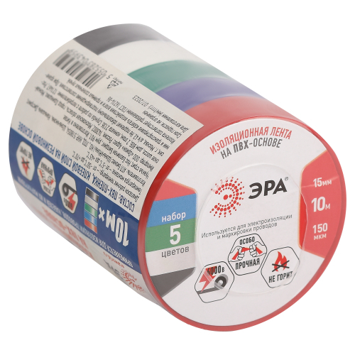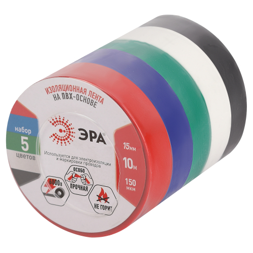 Изолента ЭРА из 5 роликов разноцветной изоляционной ленты - практичный набор на все случаи жизни: от профессионального применения до хозяйственных нужд. Изолента набор 15мм х 10метров х 0,15мм это хороший вариант для домашнего использования - запас всех основных цветов. Изолента цветная ЭРА разработана и изготовлена на основе пленки из ПВХ поливинилхлоридного изоляционного пластиката, используемой в производстве профессиональных изоляционных лент. Специальные добавки, входящие в состав данного материала, повышают эластичные свойства ленты, увеличивают ее долговечность и обеспечивают устойчивость к горению. Изоляционная лента предназначена для проведения всех видов электромонтажных работ : электрической изоляции проводников, сращиванию и жгутированию, защиты от механических повреждений, цветовой маркировки. Изоленты ЭРА соответствуют ГОСТ Р 16214-86. Изолента пвх справится с высоким напряжением: напряжение пробоя не менее 6000В. Изолента для авто обеспечивает электробезопасность соединений на долгое время. Изоляция для проводов достаточно теплостойкая, обеспечивает надежную изоляцию соединений при высоких температурах. Устойчива к УФ-лучам. ПВХ Изоленты ЭРА не горят, затухают сразу при вынесении из открытого огня. Электромонтаж и проводка не обходится без изоленты ЭРА. В цветной набор входит: изолента черная 1 шт, изолента белая 1 шт, изолента зеленая 1 шт, изолента синяя 1 шт, изолента красная 1 шт.