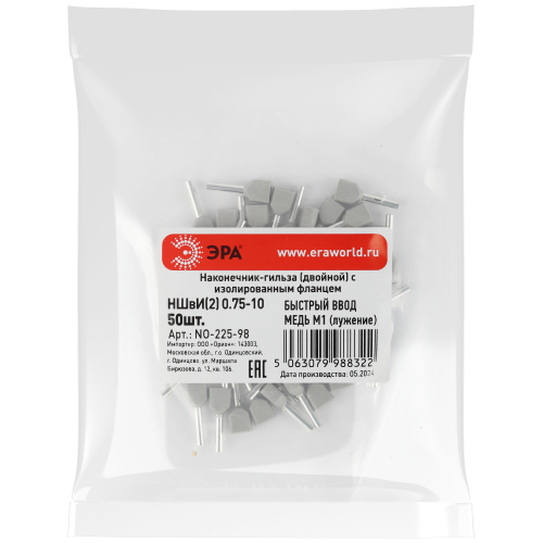 Наконечники-гильзы НШвИ(2) двойные состоят из медной луженой гильзы, один конец которой развальцован для облегчения ввода многожильного провода и изолирующей манжеты из полипропилена.