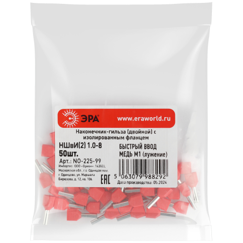 Наконечники-гильзы НШвИ(2) двойные состоят из медной луженой гильзы, один конец которой развальцован для облегчения ввода многожильного провода и изолирующей манжеты из полипропилена.