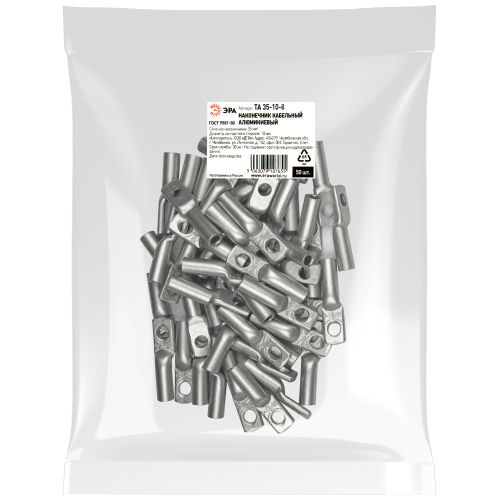 Наконечник кабельный алюминиевый ЭРА ТА 35-10-8 используется для оконцевания проводов и кабелей с алюминиевыми жилами сечением до 35 мм² и применяется для кабелей напряжением до 35 кВ.