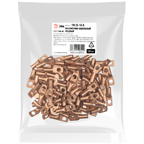 Наконечник кабельный медный ЭРА ТМ 25-10-8 используется для оконцевания проводов и кабелей с медными жилами сечением до 35 мм² и применяется для кабелей напряжением до 35 кВ.