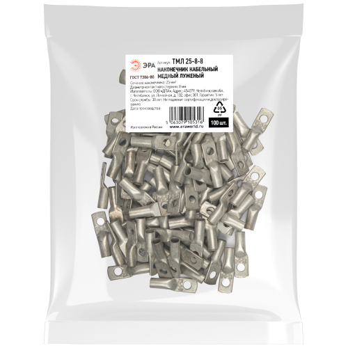Наконечник кабельный медный луженый ЭРА ТМЛ 25-8-8 используется для оконцевания проводов и кабелей с медными жилами сечением до 35 мм² и применяется для кабелей напряжением до 35 кВ.