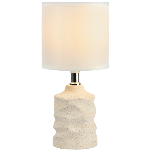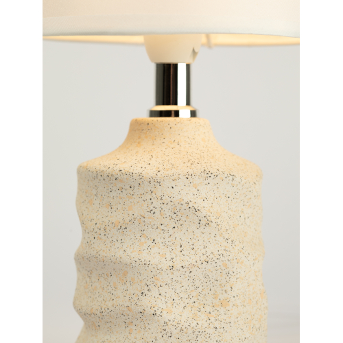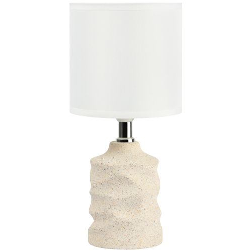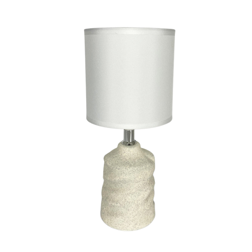 Основание с мягкой пластикой и природной текстурой напоминает форму, созданную вручную. Нейтральный песочный оттенок легко сочетается с деревом, льном и светлыми стенами. Текстильный абажур даёт мягкий рассеянный свет, идеальный для спальни и спокойных вечерних сценариев.