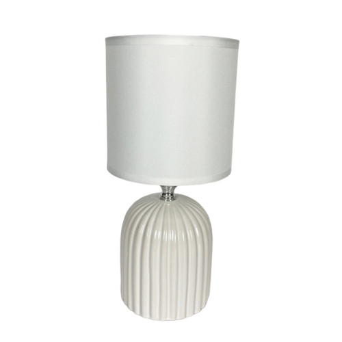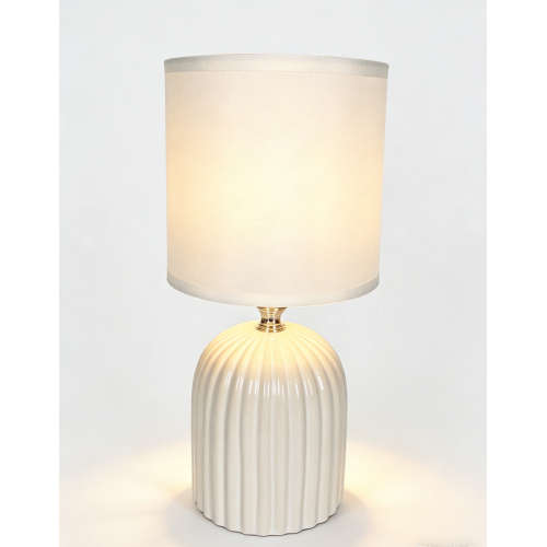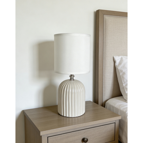 Фактурное основание в оттенке слоновая кость мягко играет светом и тенью, а текстильный абажур создаёт уютное рассеянное свечение, идеальное для спальни или зоны отдыха. Деликатная металлическая деталь добавляет изысканности, сохраняя баланс между минимализмом и дизайном вне времени.