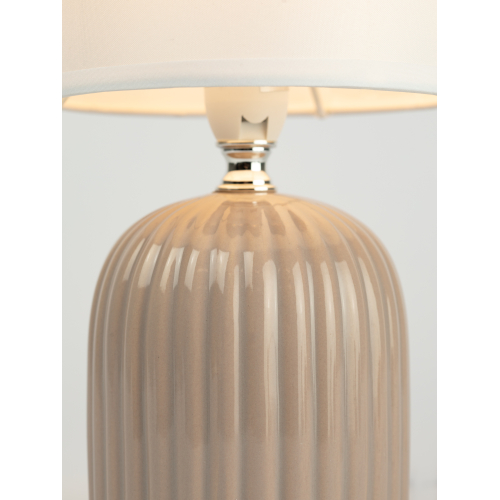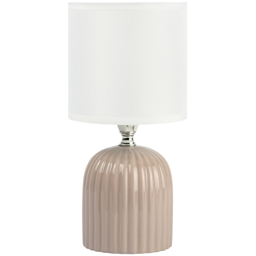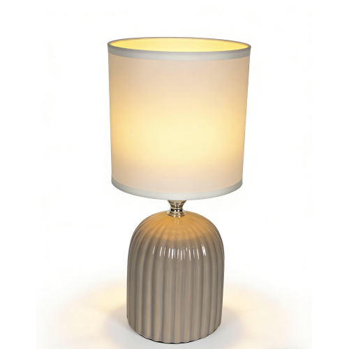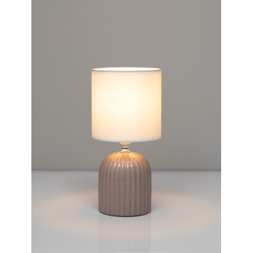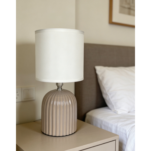 Фактурное основание в оттенке кофе с молоком мягко играет светом и тенью, а текстильный абажур создаёт уютное рассеянное свечение, идеальное для спальни или зоны отдыха. Деликатная металлическая деталь добавляет изысканности, сохраняя баланс между минимализмом и дизайном вне времени.