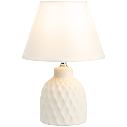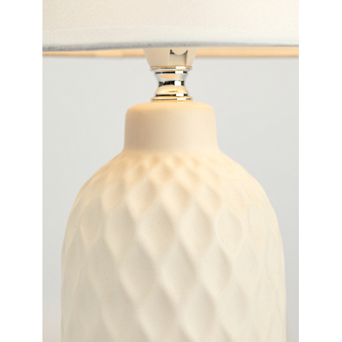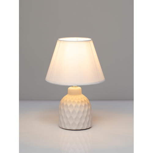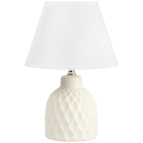 Объёмное основание с мягким рельефным рисунком напоминает игру света на текстиле или лёгкую драпировку, застывшую в матовой керамике молочного оттенка. Лаконичный белый абажур создаёт чистый, ровный свет, который мягко заполняет пространство и подчёркивает архитектуру комнаты. Такое освещение идеально для спальни. Оно формирует атмосферу уюта и спокойствия, в которой легко замедлиться и переключиться на отдых. Эта модель станет элегантным акцентом на прикроватной тумбе или консоли.