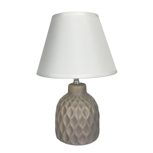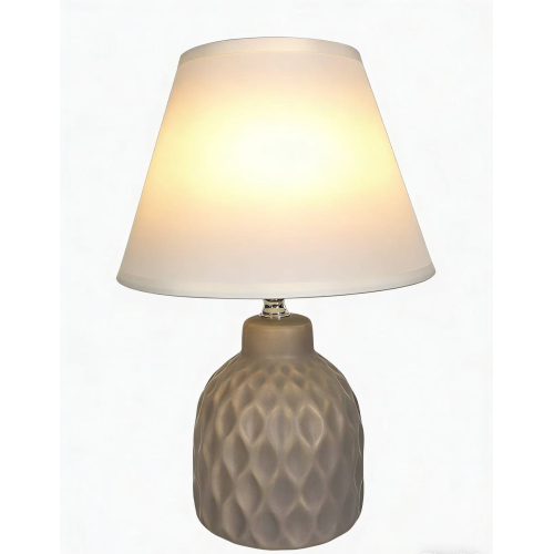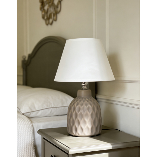 Объёмное основание с мягким рельефным рисунком напоминает игру света на текстиле или лёгкую драпировку, застывшую в матовой керамике благородного тауп-оттенка. Лаконичный белый абажур создаёт чистый, ровный свет, который мягко заполняет пространство и подчёркивает архитектуру комнаты. Такое освещение идеально для спальни. Оно формирует атмосферу уюта и спокойствия, в которой легко замедлиться и переключиться на отдых. Эта модель станет элегантным акцентом на прикроватной тумбе или консоли.
