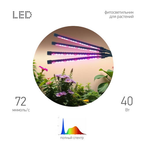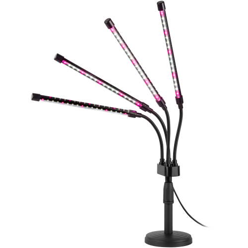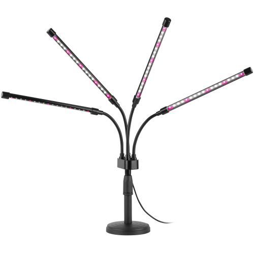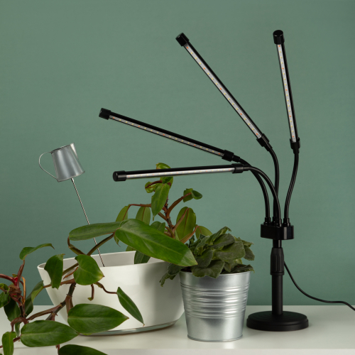 Настольный светильник полного спектра, но с красным отсветом. Подойдет для любого растения, так как в спектре излучения присутствуют все длины волн. Основной упор в излучении сделан на поддержание оптимального фотосинтеза и набор массы растением. Светильник имеет легко регулирующееся основание, четыре независимых по работе гнущихся плафона. Черный цвет корпуса легко вписывается в любой интерьер.