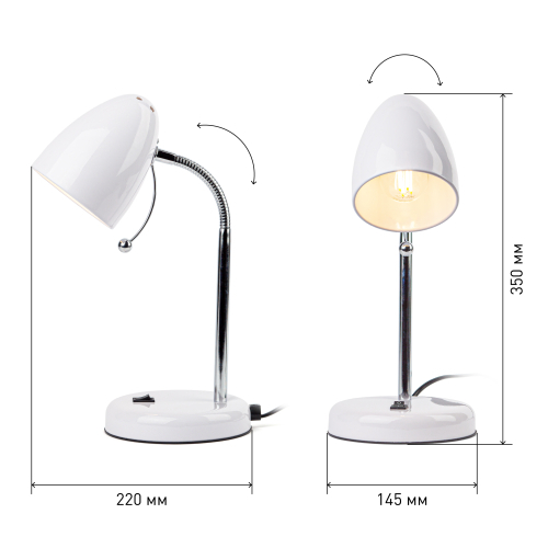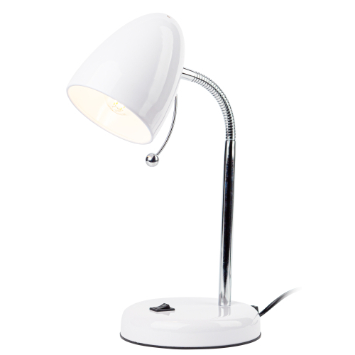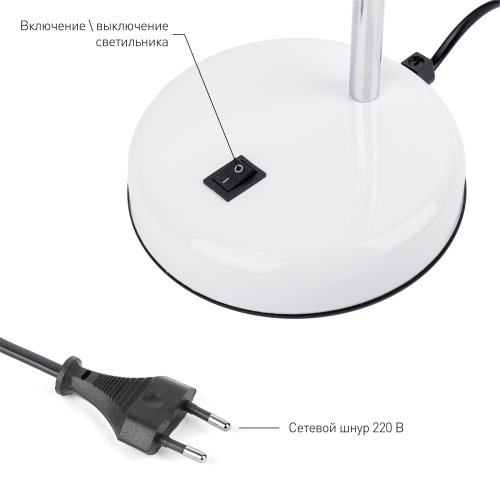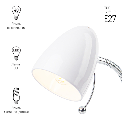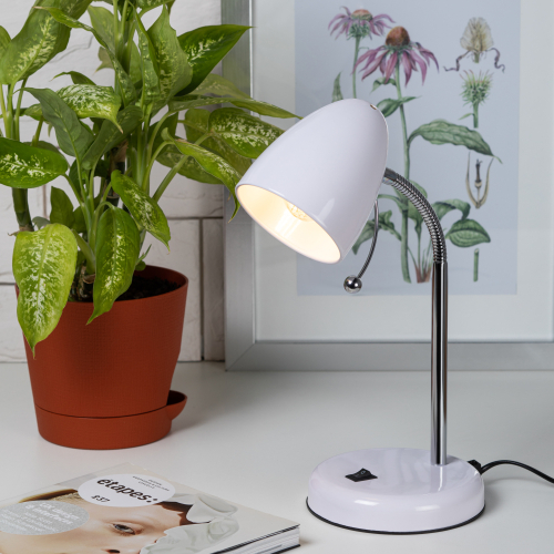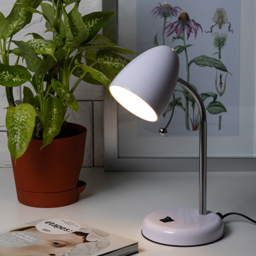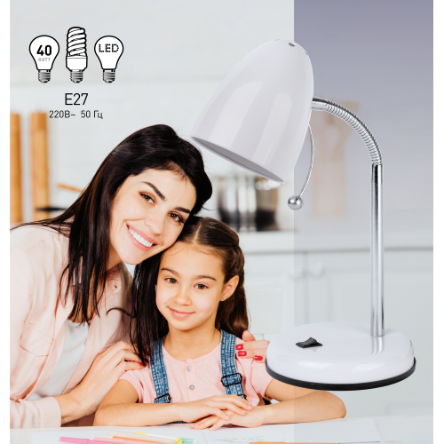 Настольный светильник ЭРА N-116-Е27-40W-W с цоколем Е27 компактного размера для удобного размещения на столе. Может использоваться с лампой накаливания, компактной люминесцентной лампой (КЛЛ) или светодиодной (LED) лампой. У светильника металлические стойка и плафон, выключатель на основании. Высота расположения плафона регулируется сгибающейся стойкой, направление света - наклоном и поворотом плафона в любом направлении.