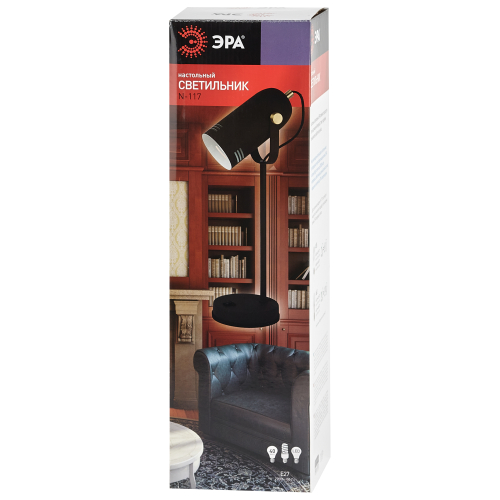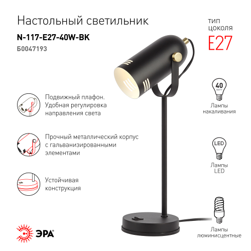 Красивый и удобный настольный светильник ЭРА N-117-Е27-40W-BK в стильном "ретро" корпусе. Может использоваться с разными источниками света - лампой накаливания, компактной люминесцентной лампой (КЛЛ) или светодиодной (LED) лампой. Прочный металлический корпус украшен гальванизированными элементами. Подвижный плафон позволяет регулировать направление света. В числе преимуществ для комфортного использования - устойчивость конструкции и оптимальные размеры для размещения на столе. Трендовый дизайн и актуальное сочетание цветов (черный корпус с матовыми золотистыми деталями) сделают этот светильник изюминкой интерьеров, особенно в стиле лофт или минимализм.