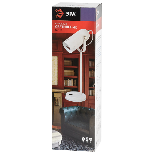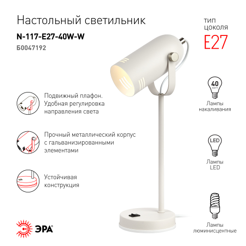 Красивый и удобный настольный светильник ЭРА N-117-Е27-40W-W в стильном "ретро" корпусе. Может использоваться с разными источниками света - лампой накаливания, компактной люминесцентной лампой (КЛЛ) или светодиодной (LED) лампой. Прочный металлический корпус украшен гальванизированными элементами. Подвижный плафон позволяет регулировать направление света. В числе преимуществ для комфортного использования - устойчивость конструкции и оптимальные размеры для размещения на столе. Трендовый дизайн и актуальное сочетание цветов (белый корпус с матовыми серебристыми деталями) сделают этот светильник изюминкой интерьеров, особенно в стиле лофт или минимализм.