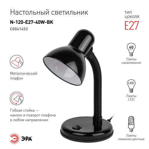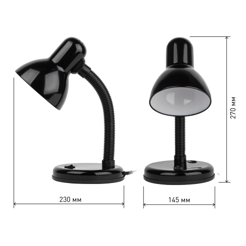 Светильник может использоваться с лампой накаливания, компактной люминесцентной лампой (КЛЛ) или светодиодной (LED) лампой. Устойчивое основание. Металлический плафон. Наклон и поворот плафона в любом направлении.