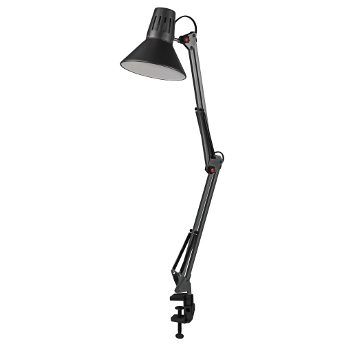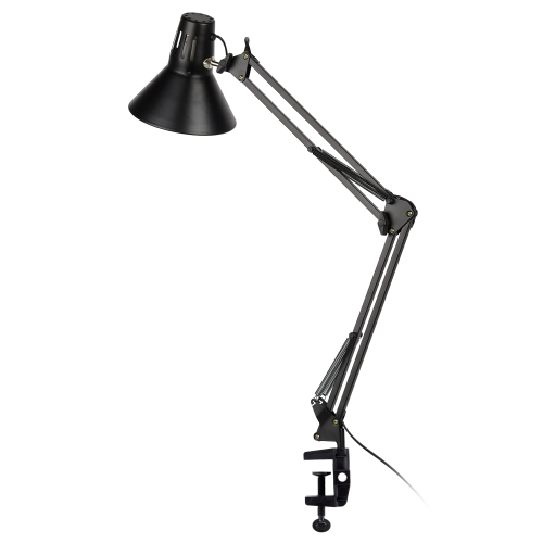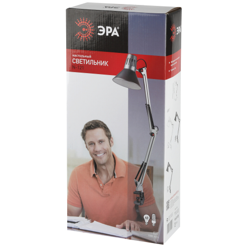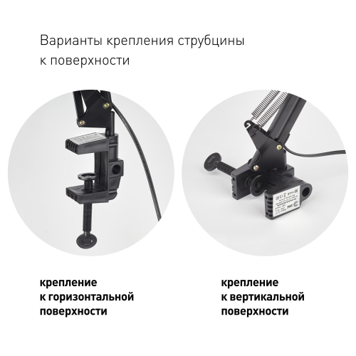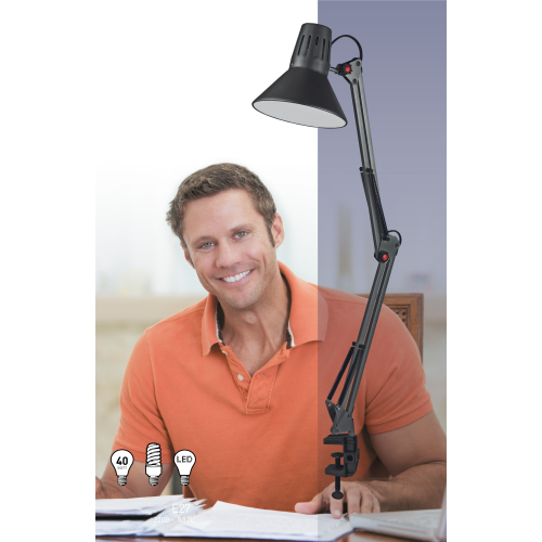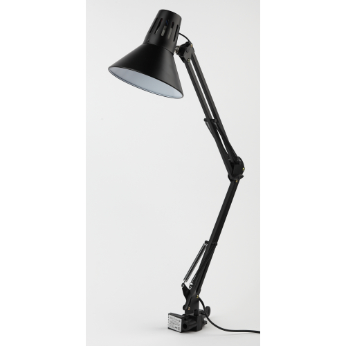 Светильник может использоваться с лампой накаливания, компактной люминесцентной лампой (КЛЛ) или светодиодной (LED) лампой. Надежная пластиковая струбцина для крепления к краю поверхности. Металлические стойка и плафон. Высота плафона регулируется двухсекционной сгибающейся стойкой. Направление света регулируется поворотом и наклоном плафона в любом направлении.