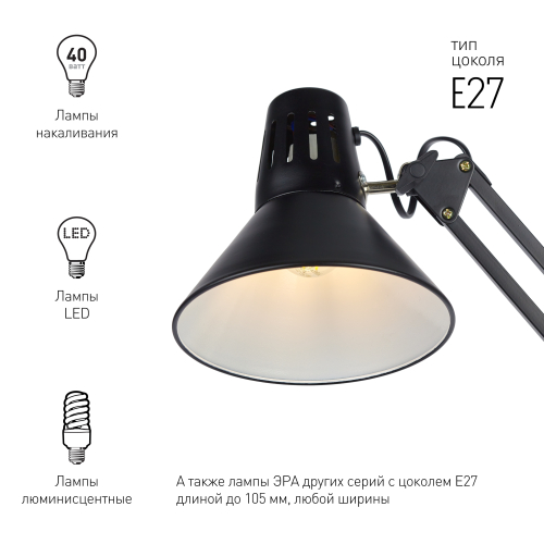 Настольный светильник ЭРА N-121-E27-40W-BK классического дизайна может использоваться с разными источниками света - лампой накаливания, компактной люминесцентной лампой (КЛЛ) или светодиодной (LED) лампой. Выключатель на проводе. Крепится на струбцину. Высота плафона регулируется двухсекционной сгибающейся стойкой, направление света - поворотом и наклоном плафона в любом направлении.