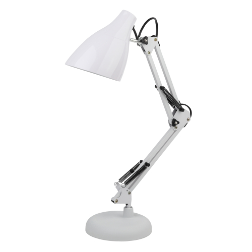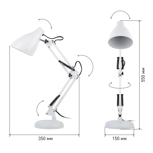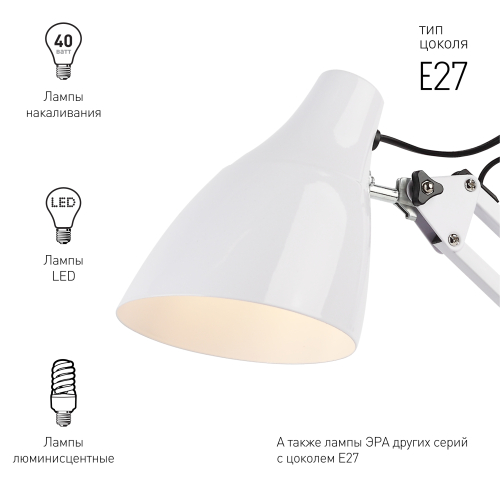 Настольный светильник ЭРА N-123-Е27-40W-W трендового дизайна с классической конструкцией может использоваться с разными источниками света - лампой накаливания, компактной люминесцентной лампой (КЛЛ) или светодиодной (LED) лампой. Выключатель на проводе. Устойчивое основание. Высота плафона регулируется двухсекционной сгибающейся стойкой, направление света - поворотом и наклоном плафона в любом направлении.