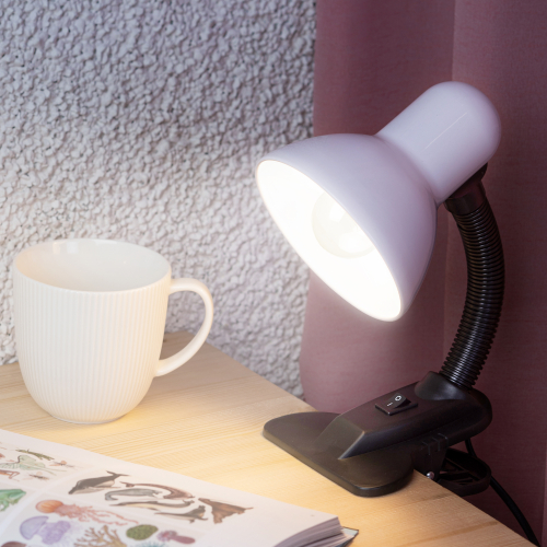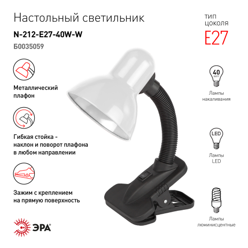 Настольный светильник-прищепка ЭРА N-212-E27-40W-W может использоваться с лампой накаливания, компактной люминесцентной лампой (КЛЛ) или светодиодной (LED) лампой. У светильника прочная удобная прищепка и металлический плафон. Наклон и поворот плафона в любом направлении для удобного направления света. Поставляется в "мягкой упаковке" - индивидуальном ПЭ пакете