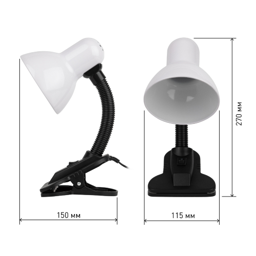 Светильник может использоваться с лампой накаливания, компактной люминесцентной лампой (КЛЛ) или светодиодной (LED) лампой. Прочная прищепка. Металлический плафон. Наклон и поворот плафона в любом направлении. Светильник поставляется в "мягкой" упаковке (ПЭ пакет).