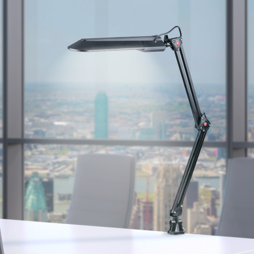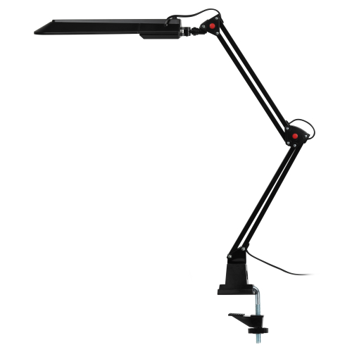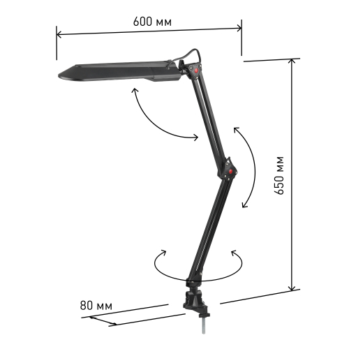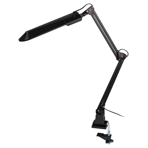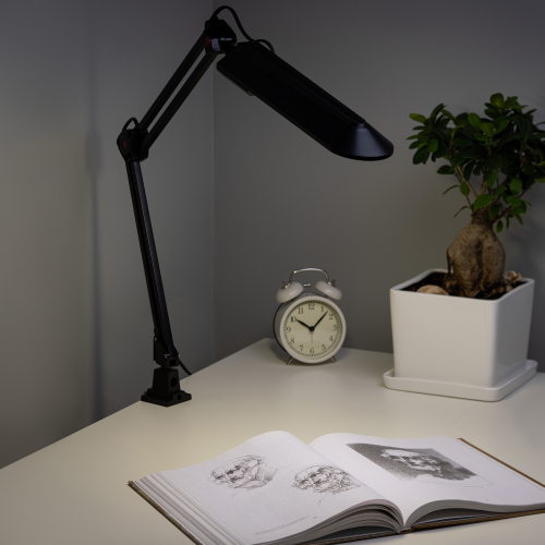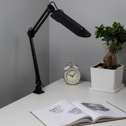 Светильник предназначен для использования с энергосберегающей лампой, лампа входит к комплект. Удобное крепление на струбцину к любой плоской поверхности. Высота плафона регулируется двухсекционной сгибающейся стойкой.