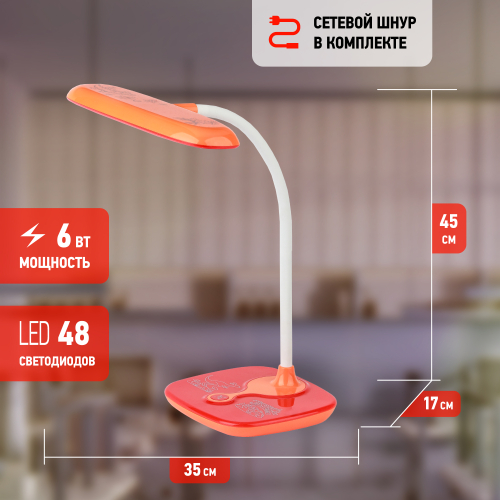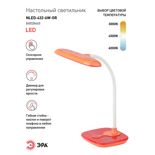 Настольный светильник для детей ЭРА NLED-432-6W-OR со светодиодами (LED) в качестве источников света. Оснащен сенсорным управлением, возможностью выбора цветовой температуры (теплый, нейтральный или холодный свет). Яркость регулируется при помощи плавного диммера. Удобный выбор направления света - наклон и поворот плафона в любом направлении. Яркий детский дизайн с веселым узором на основание оживит комнату и станет верным помощником для ребенка в учебе или творчестве.