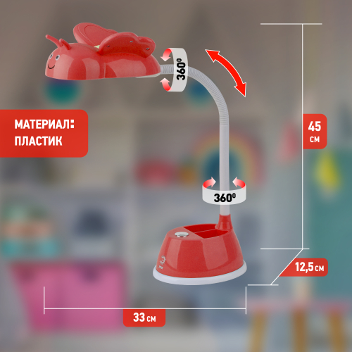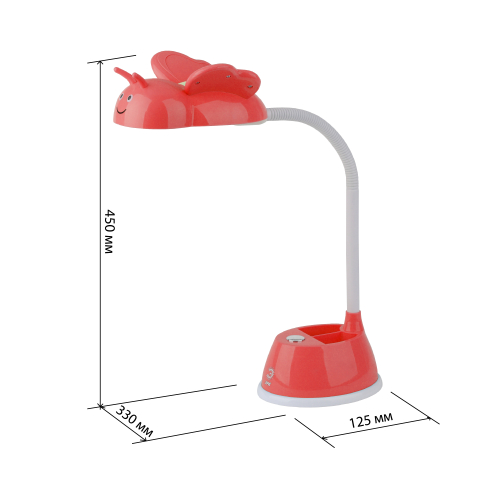 Светильник со светодиодами (LED) в качестве источников света. Направление света регулируется поворотом плафона в любом направлении под любым углом. Теплый свет, аналогичный свету лампы накаливания - цветовая температура 3000К. Удобная подставка на основании поможет всегда иметь ручку, карандаши или линейку под рукой. Детский дизайн плафона в виде пчелки.