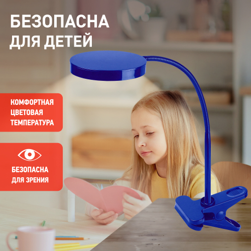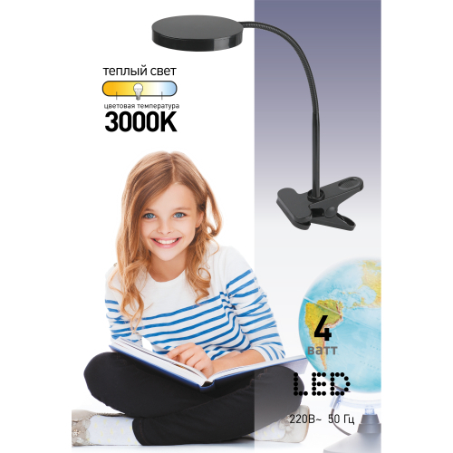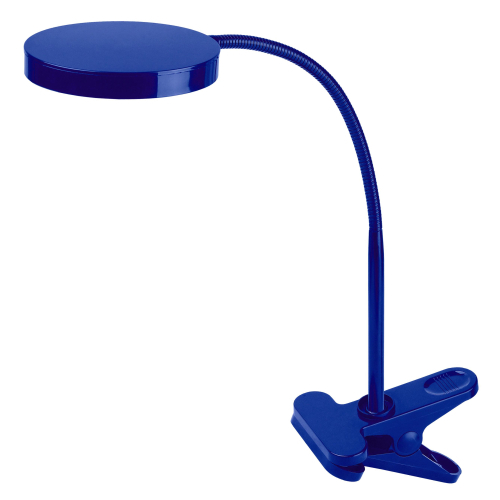 Настольный светильник ЭРА NLED-435-4W-BU со светодиодами (LED) в качестве источников света с прищепкой и длинной гибкой стойкой. Выключатель на плафоне (панели со светодиодами). Направление света регулируется поворотом плафона в любом направлении под любым углом.