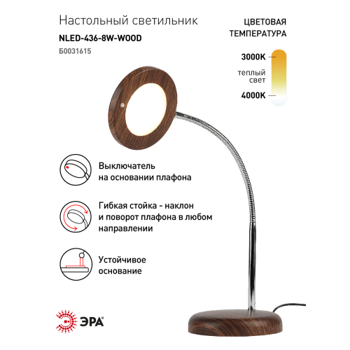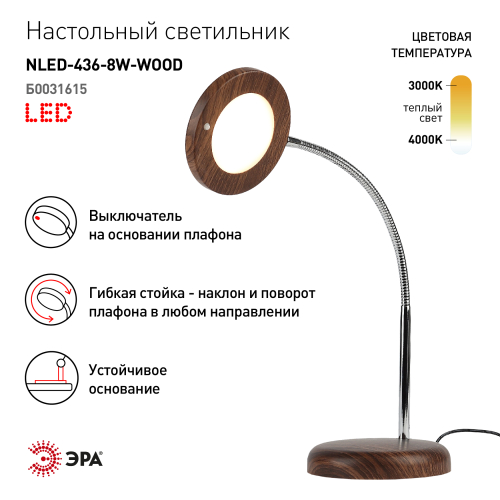 Настольный светильник ЭРА NLED-436-8W-WOOD со светодиодами (LED) в качестве источников света с поверхностью цвета дерева. Направление света регулируется поворотом плафона в любом направлении под любым углом. Светильник создаст привлекательный акцент в любом интерьере, особенно в теплых тонах или где есть деревянные предметы мебели.