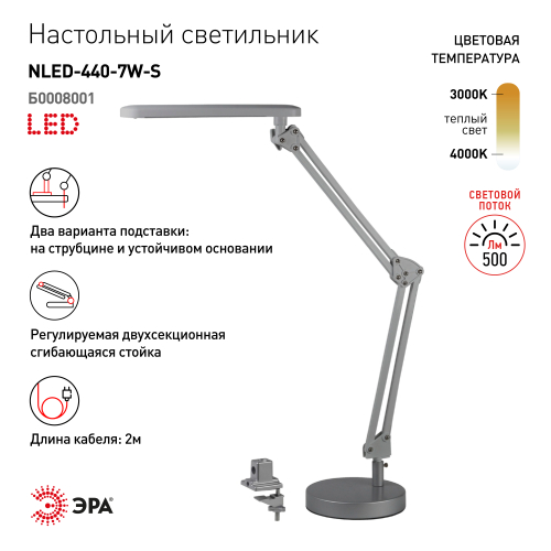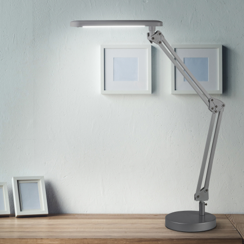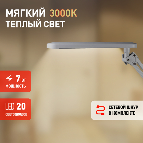 Настольный светильник со светодиодами (LED) в качестве источников света. Теплый свет, аналогичный свету лампы накаливания - цветовая температура 3000К. Выключатель на плафоне. Высота плафона регулируется двухсекционной сгибающейся стойкой. Два варианта крепления в комплекте: основание, струбцина.