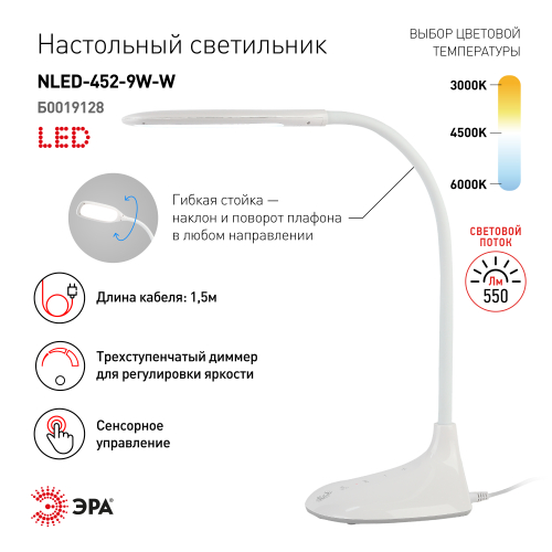 Настольный светильник ЭРА NLED-452-9W-W со светодиодами (LED) в качестве источников света. Оснащен сенсорным управлением, возможностью выбора цветовой температуры (теплый, нейтральный или холодный свет). Есть регулировка яркости освещения, 5 уровней. Удобный выбор направления света - наклон и поворот плафона в любом направлении. Актуальный и в то же время лаконичный дизайн. Устойчивое основание компактного размера для удобного размещения на столе.
