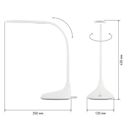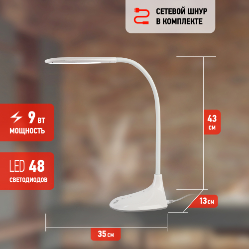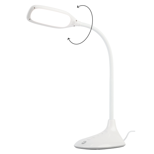 Светильник со светодиодами (LED) в качестве источников света. Выбор цветовой температуры - 3 цвета: 3000К, 4500К, 6000К. Сенсорное переключение. Пятиступенчатый диммер для регулировки яркости. Гибкая стойка - наклон и поворот плафона в любом направлении.