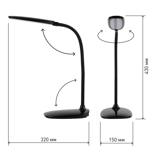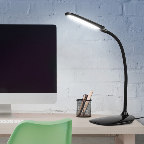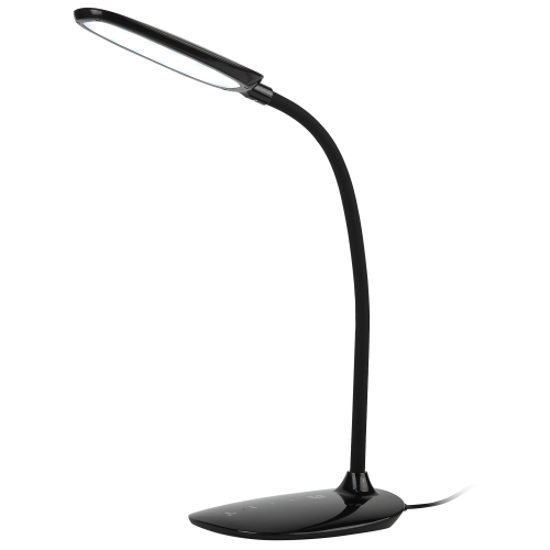 Светильник со светодиодами (LED) в качестве источников света. Выбор цветовой температуры - 3 цвета: 3000К, 4500К, 6000К. Сенсорное переключение. Пятиступенчатый диммер для регулировки яркости. Гибкая стойка - наклон и поворот плафона в любом направлении.