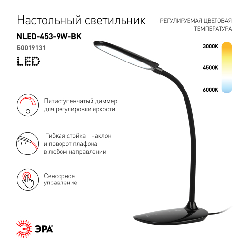 Настольный светильник ЭРА NLED-453-9W-BK со светодиодами (LED) в качестве источников света. Оснащен сенсорным управлением, возможностью выбора цветовой температуры (теплый, нейтральный и холодный свет). Есть регулировка яркости освещения, 5 уровней. Удобный выбор направления света - наклон и поворот плафона в любом направлении. Актуальный и в то же время лаконичный дизайн, устойчивое основание обтекаемой формы.