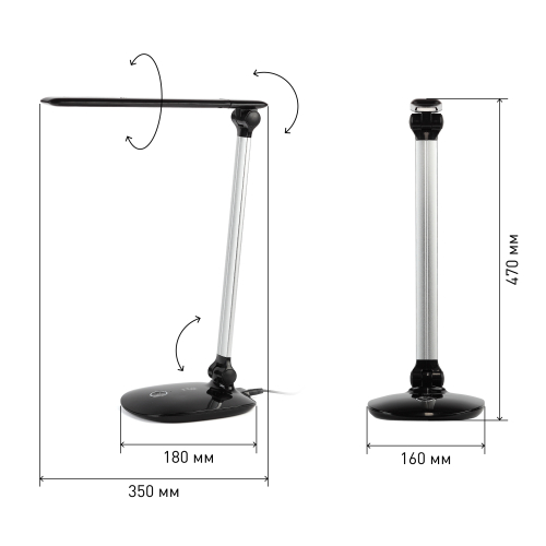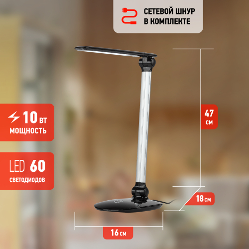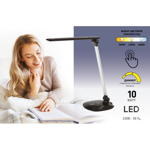 Настольный светильник ЭРА NLED-456-10W-BK-S со светодиодами (LED) в качестве источников света. Оснащен сенсорным управлением с возможностью выбора цветовой температуры (теплый, нейтральный или холодный свет). Плавный диммер для регулировки яркости. Наклон металлической стойки и поворот плафона относительно стойки позволяют удобно направлять свет. Складная конструкция для оптимального хранения. Современный актуальный дизайн с высоким качеством исполнения, с металлической стойкой.