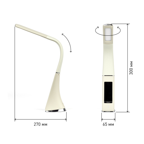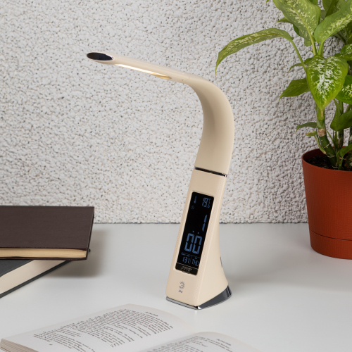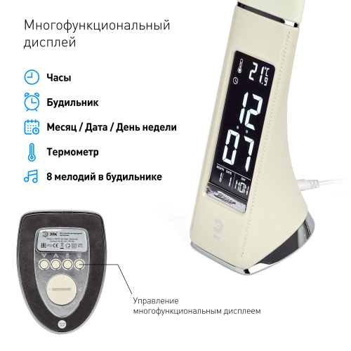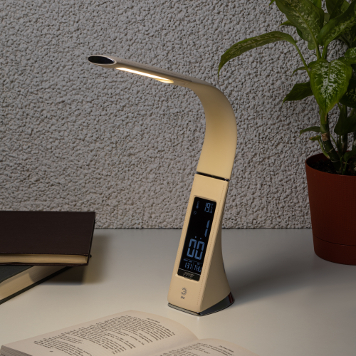 Настольный светильник ЭРА NLED-461-7W-BG со светодиодами (LED) в качестве источников света в дизайне "под кожу". Оснащен сенсорным управлением, есть регулировки яркости освещения - 3 уровня. Главное преимущество светильника - ЖК дисплей с функциями часов, будильника, календаря и термометра. Сенсорная кнопка с обратной стороны стойки обеспечивает опцию выбора яркости дисплея с возможностью его выключения. Высота плафона регулируется гибкой стойкой, направление света регулируется поворотом плафона в любом направлении.