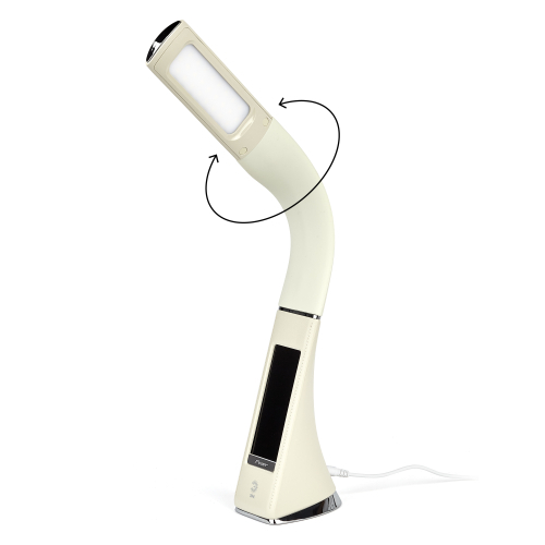 Настольный светильник со светодиодами (LED) в качестве источников света в дизайне под кожу . Нейтральный белый свет - цветовая температура 4000К. Сенсорное переключение. Трехступенчатый диммер для регулировки яркости. ЖК дисплей с функциями часов, будильника, календаря и термометра. Выбор яркости дисплея с возможностью его выключения.