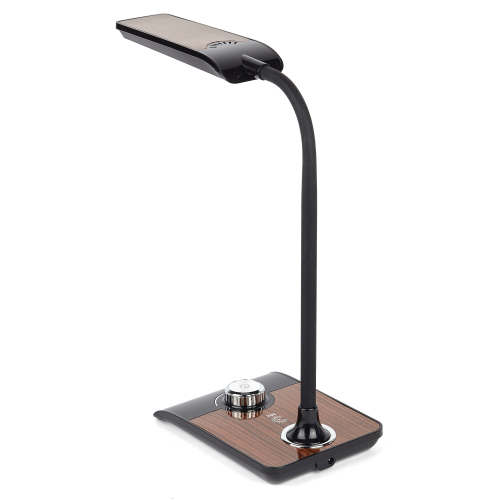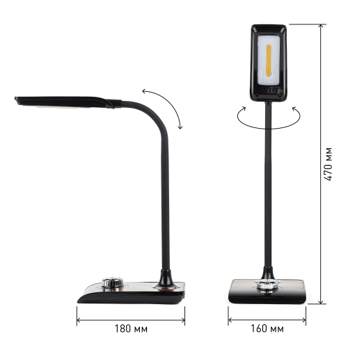 Настольный светильник со светодиодами (LED) в качестве источников света. Выбор цветовой температуры - 3 цвета: 3000К, 4500К, 6000К. Сенсорный переключатель на основании. Плавный диммер для регулировки яркости. Гибкая стойка.