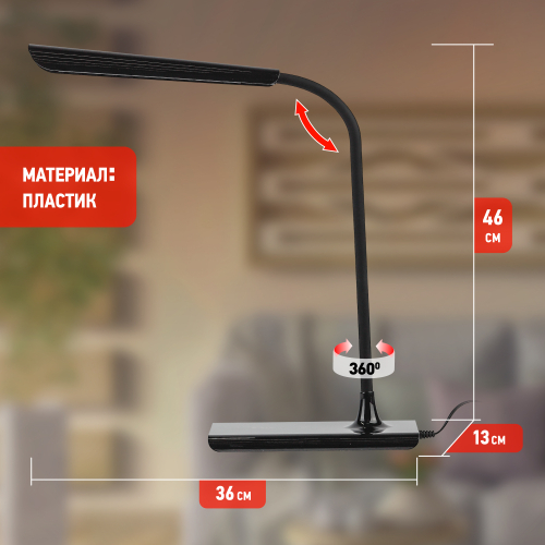 Светильник со светодиодами (LED) в качестве источников света. Цветовая температура 4000К. Сенсорное переключение. Плавный диммер для регулировки яркости. Функция беспроводной зарядки. В комплекте внешние модули беспроводной зарядки: Lightning (для iPhone 5 и выше) и Micro-USB (для Android). USB разъем для зарядки устройств. Высота плафона регулируется гибкой стойкой, направление света регулируется поворотом плафона в любом направлении.