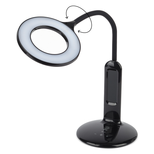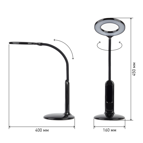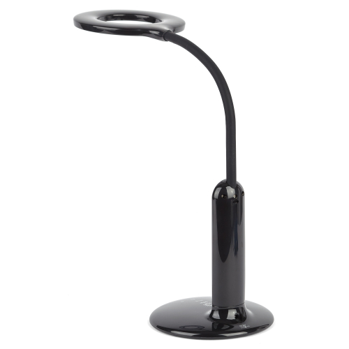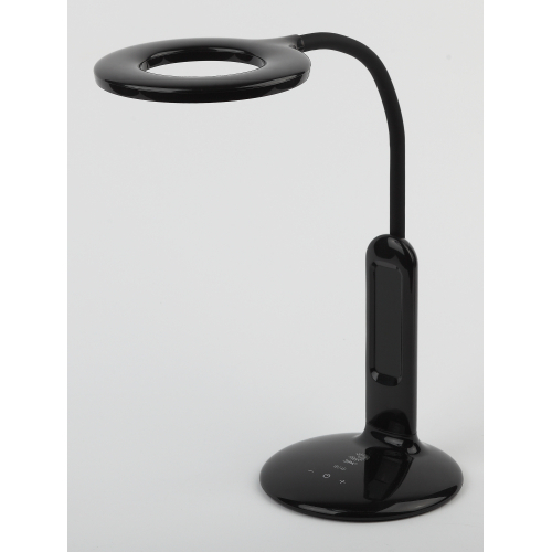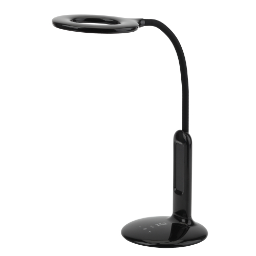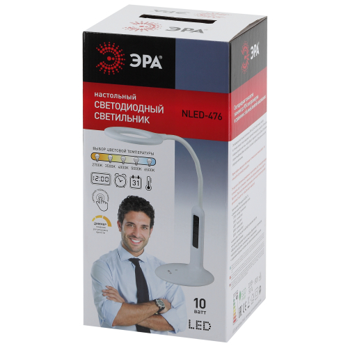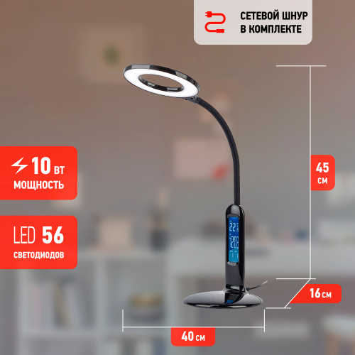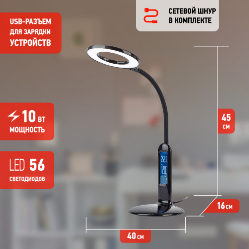 Настольный светильник ЭРА NLED-476-10W-BK со светодиодами (LED) в качестве источников света. У светильника сенсорное управление, плавный или ступенчатый (на выбор) диммер для регулировки яркости. 5 режимов цветовой температуры света: мягкий теплый свет, теплый свет, белый свет, дневной свет, холодный свет. Главное преимущество светильника - ЖК дисплей с функциями часов, будильника, календаря и термометра. Светильник сохраняет выбранные настройки света при включении-выключении. Высота плафона регулируется гибкой стойкой, направление света - поворотом плафона в любом направлении. Плафон кольцевой формы оптимально распределяет свет, это очень удобно и отлично подходит для мелкой ручной работы.