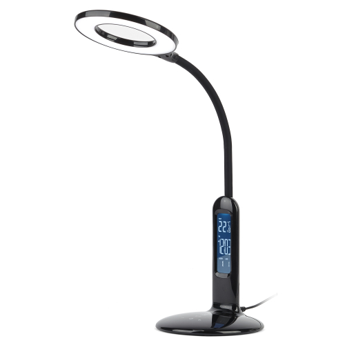 Настольный светильник со светодиодами (LED) в качестве источников света. 5 режимов цветовой температуры света: 2700К - мягкий теплый свет, 3500К - теплый свет, 4000К - белый свет, 5000К - дневной свет, 6500К - холодный свет. Сенсорный переключатель на основании. Плавный или ступенчатый (на выбор) диммер для регулировки яркости. ЖК дисплей с функциями часов, будильника, календаря и термометра. Выбор яркости дисплея с возможностью его выключения. Сохранение выбранных настроек света при включении-выключении. Гибкая стойка.