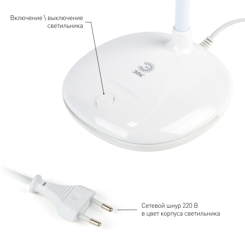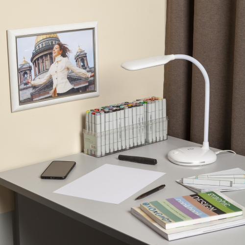 Настольный светильник ЭРА NLED-477-8W-W со светодиодами (LED) в качестве источников света. У светильника выключатель на основании. Это базовая модель с оптимальным универсальным дизайном хорошей для работы за столом высоты (40 см). Гибкая стойка позволяет выбирать наиболее комфортное направление света.