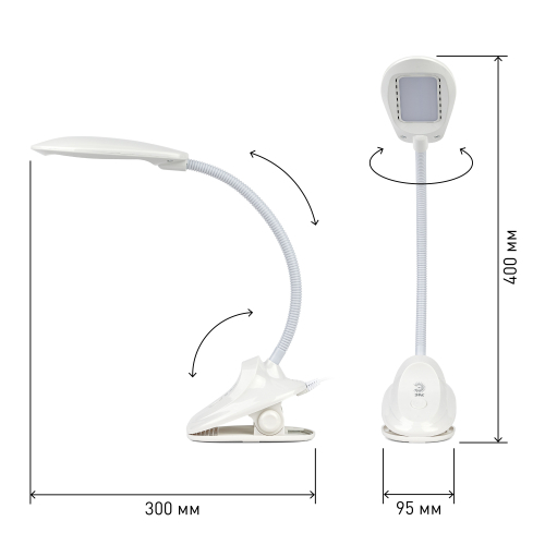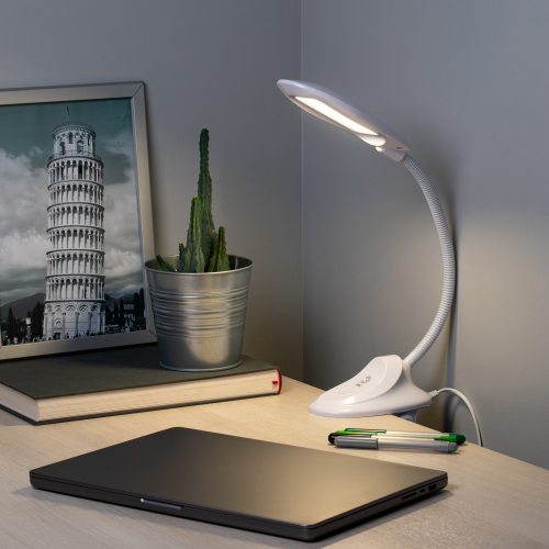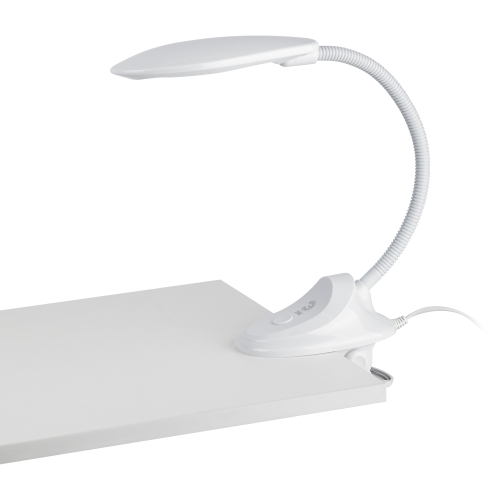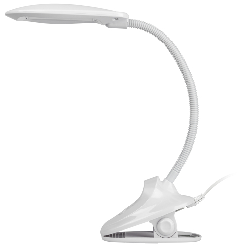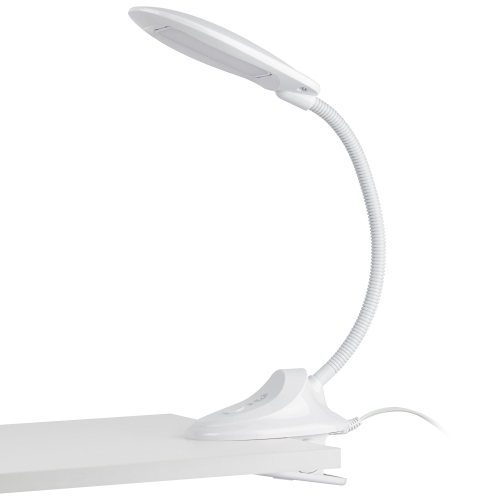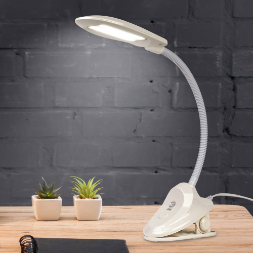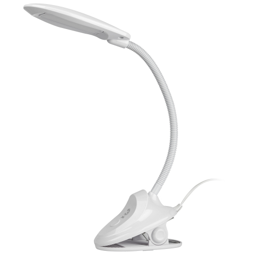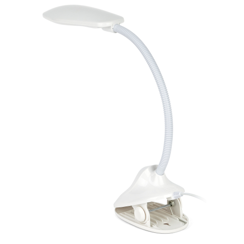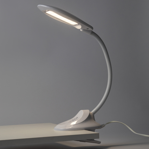 Настольный светильник со светодиодами (LED) в качестве источников света. На прищепке. Нейтральный белый свет - цветовая температура 4000К. Выключатель на прищепке. Гибкая стойка.