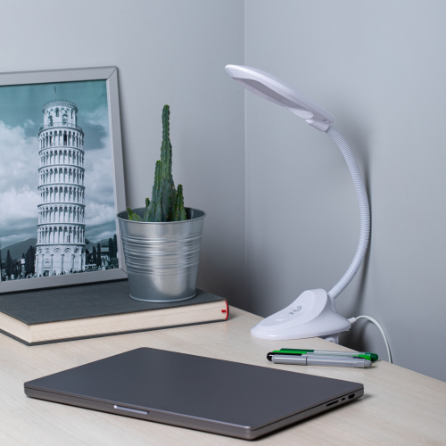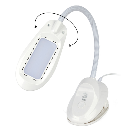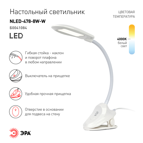 Настольный светильник-прищепка ЭРА NLED-478-8W-W со светодиодами (LED) в качестве источников света. У светильника выключатель на основании. Это базовая модель с оптимальным универсальным дизайном хорошей для работы за столом высоты. Гибкая стойка позволяет выбирать наиболее комфортное направление света.