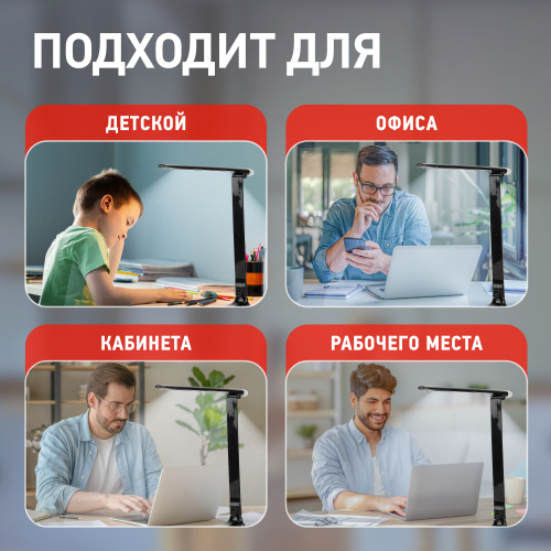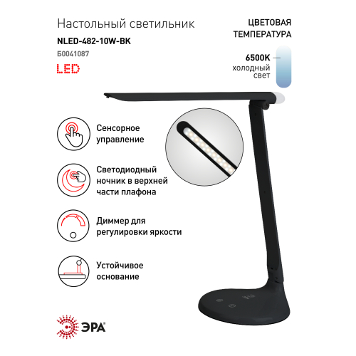 Настольный светильник ЭРА NLED-482-10W-BK - удобная складная модель с сенсорным управлением, с тремя уровнями яркости и светодиодным ночником в верхней части плафона. Светит холодным белым светом, который бодрит и повышает работоспособность. Ночник в верхней части плафона имеет отдельный сенсорный выключатель на основании.