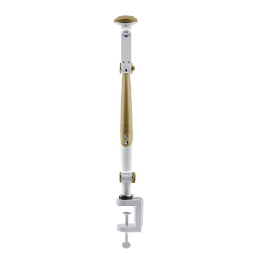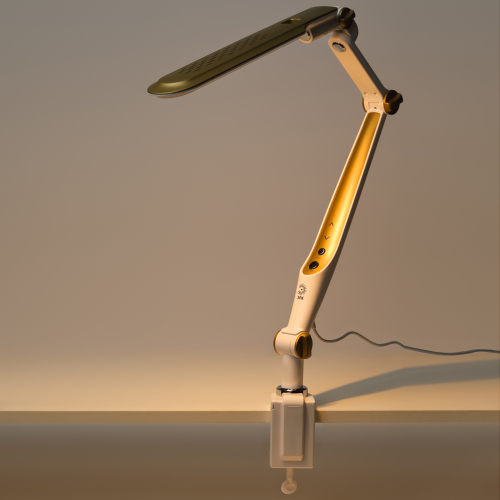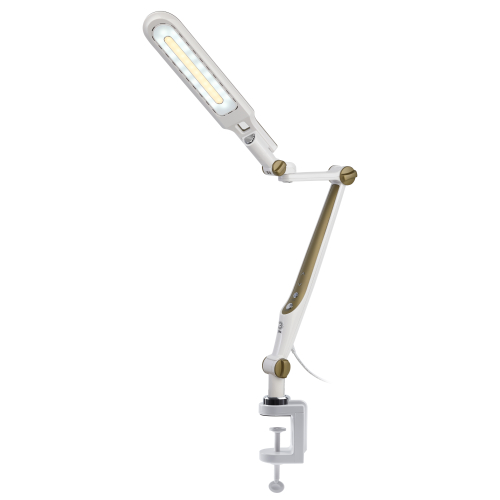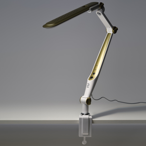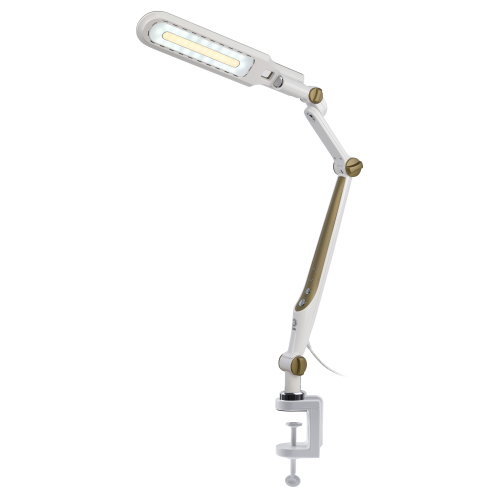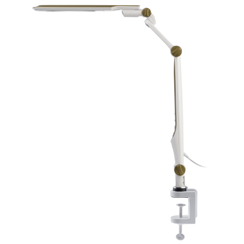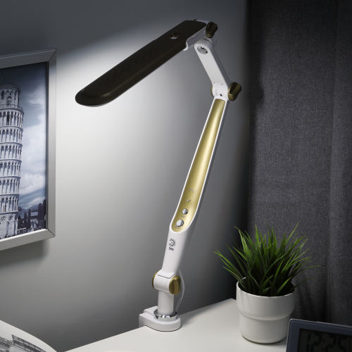 Настольный светильник со светодиодами (LED) в качестве источников света. Выбор цветовой температуры - 3 цвета: 3000К, 4500К, 6000К. Сенсорный переключатель на стойке. Плавный диммер для регулировки яркости. Светильник сохраняет выбранные настройки при включении-выключении. Высота плафона регулируется двухсекционной сгибающейся стойкой, направление света регулируется поворотом и наклоном плафона в любую сторону. Модель на струбцине.
